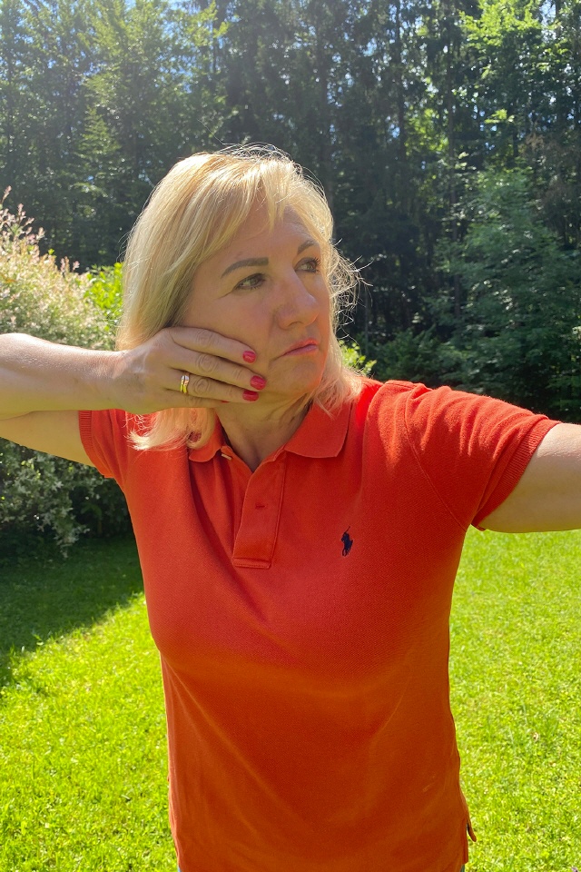 Erklären: Mittel oder Zeigefinger sind am Mundwinkel und Hand liegt fest am Gesicht.