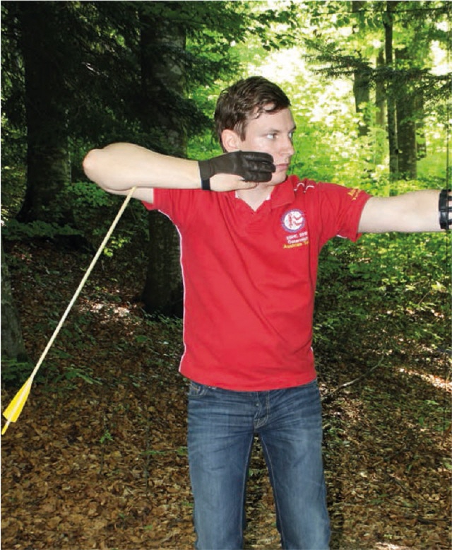 Schritt 2: Nun geht man in die Rückenspannung. Das heißt, dass man am Ankerpunkt im Gesicht bleibt und ein bis zwei Zentimeter weiter zieht. Bleibt die Hand am Ankerpunkt, und man zieht weiter, muss der Ellbogen eine Rotationsbewegung machen. Diese Bewegung sieht man von außen fast nicht. Aber es ist die Garantie, dass man aus der Spannung schießt.