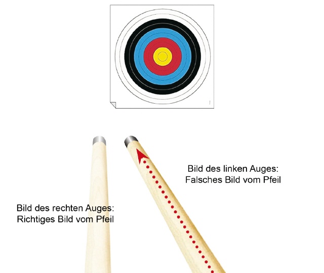 Normalerweise hat ein Rechtshänder ein rechtsdominantes, ein Linkshänder ein linksdominantes Auge. Das bedeutet, dass das Bild dieses Auges zur beispielsweisen Bestimmung der Richtung vom Gehirn verwendet wird. Nun gibt es Schützen, bei denen das andersrum ist. Man spricht dann von Kreuzdominanz. Bei Kreuzdominanz wird aber das falsche Bild genommen, hier das rechte und das eigentlich richtige ausgefiltert. Damit schießt man links vorbei.