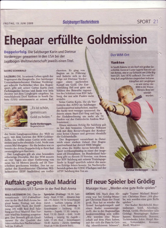 Bei der Jagdbogen-Weltmeisterschaft in Yankton/South Dakota/USA holten Karin und Dietmar Vorderegger jeweils in der Langbogenklasse Gold. Dieses Kunststück, gleich zwei Goldmedaillen bei einem großen internationalen Turnier zu holen, gelang ihnen bereits davor schon zweimal.