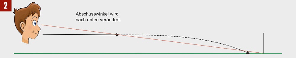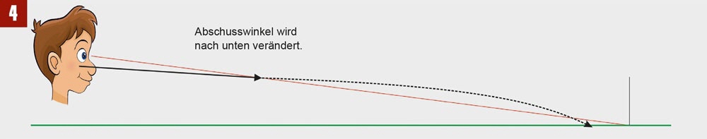 Wenn man zu tief anlegt, muss man den Abschusswinkel nach oben korrigieren. Dadurch schießt der Pfeil über das eigentliche Ziel hinaus.