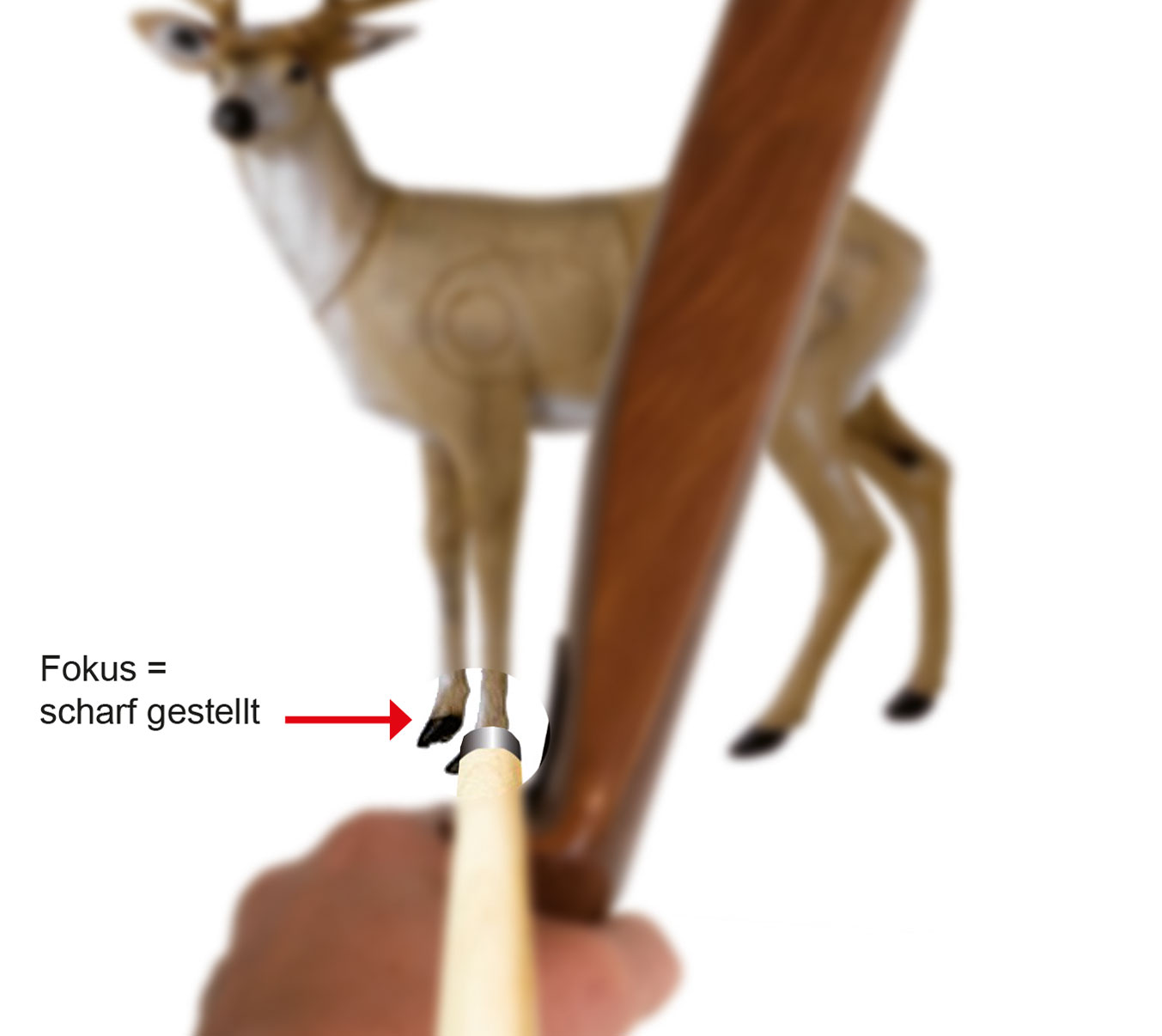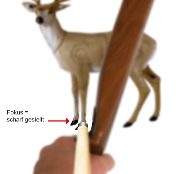 Zuerst ist der Fokus am Ziel. Dann wechselt man den Fokus und beobachtet, wo die Pfeilspitze in Relation zum Ziel (drüber oder drunter) steht und merkt sich das. Danach setzt man wieder ab.