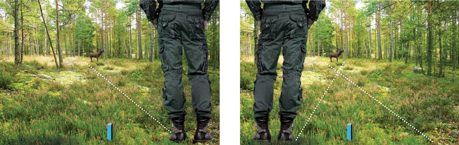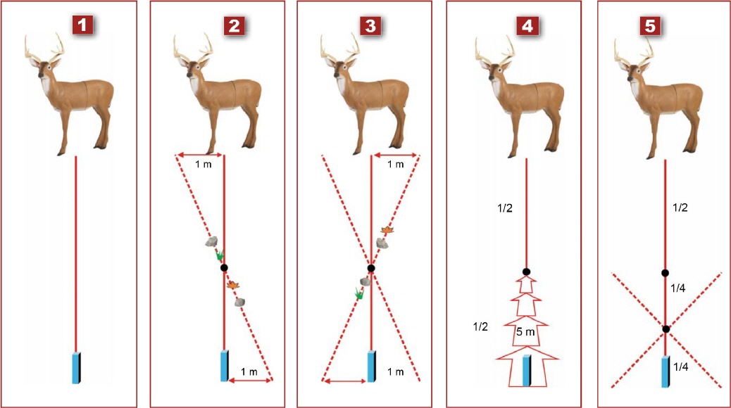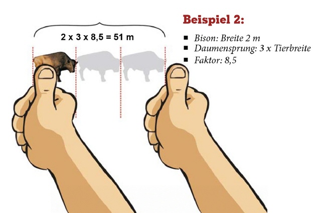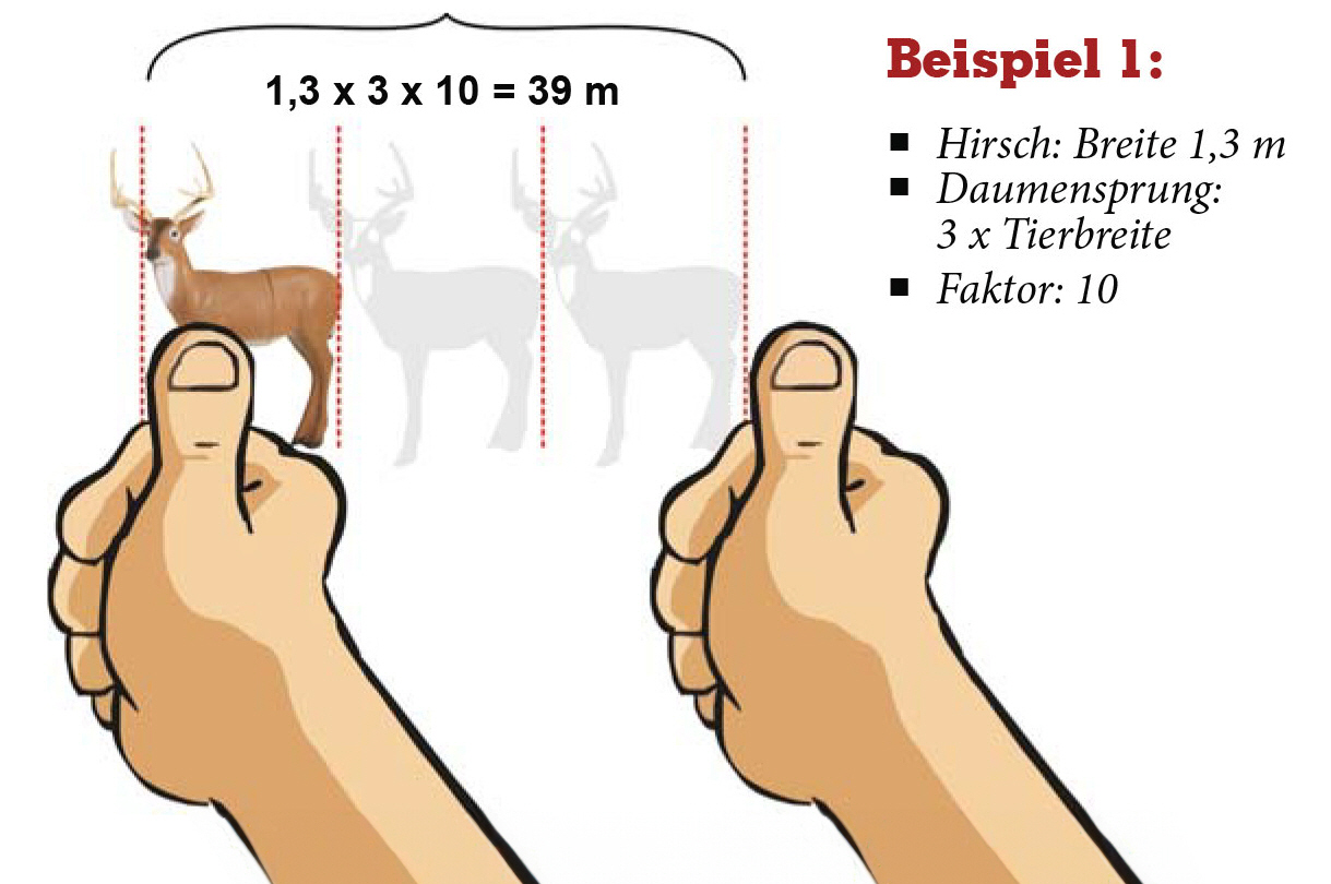 Im Gelände kann unser Unterbewusstsein bereits aufgrund der Gegebenheiten ein erstes Gefühl für die Entfernung entwickeln. Orientierung bietet dabei die relative Größe bekannter Objekte wie 3-D-Tiere oder Bäume. Das gefühlsmäßige Einschätzen von Entfernungen ist besonders für instinktive Schützen wichtig. Hierbei genügt oft eine grobe Kategorisierung:
