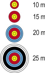 1. Definition des Streukreises auf verschiedene Entfernungen. Beispielsweise könnte ich auf 10, 15, 20 und 25 Meter meinen Streukreis - am besten auf eine FITA-Auflage - bestimmen. Dazu muss man auf jede Entfernung mehrere Male sechs Pfeile schießen. Es könnte sich dabei ein Bild, wie in Abb. 4 dargestellt, ergeben.